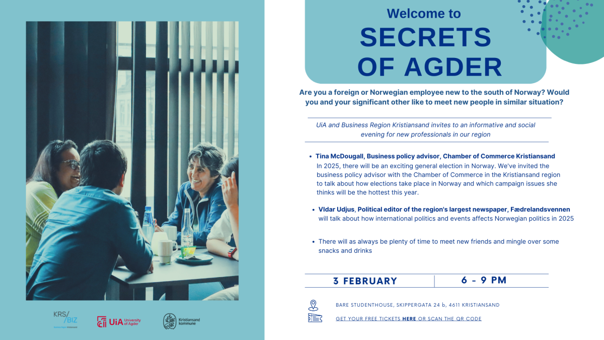 Secrets of Agder starter kl. 18 og avsluttes kl. 21. Den første timen ønsker vi at alle skal bli bedre kjent med regionen de har bosatt seg i. Det er forskjellige temaer og foredragsholdere hver gang.